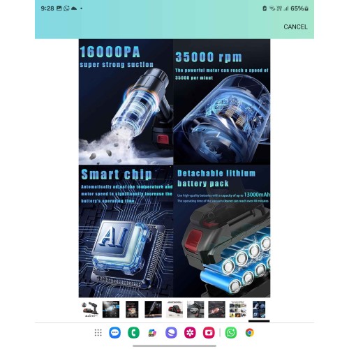 [18000PA Powerful Suction Car VacuumThe handheld car vacuum featuring a robust 18000Pa suction force and a power motor speed of 60,000 RPM to provide a powerful cleaning power. Effortlessly tackle car dust, pet hair and food scraps. Experience the cleaning power with this portable cordless car vacuum cleaner, make it ideal for everyday home use and all your cleaning needs