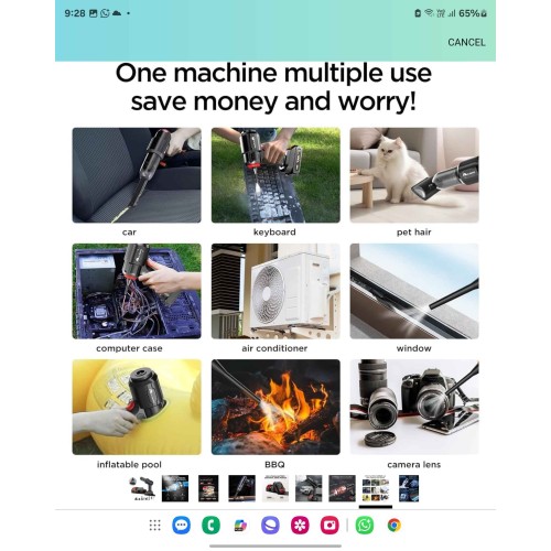 4-IN-1 Car Vacuum CleanerThe hand held vacuum cleaner with multiple working modes (suction, blowing, inflation) and includes 6 attachments for various cleaning tasks. The floor brush and nozzle brush easily remove dirt and debris, while the blowing nozzle clears dust from tight spaces like keyboards. The quick inflation function is perfect for items like swimming rings, enhancing family fun and outdoor activities. This flexible and cordless vacuum cleaner is a must-have for your daily routine
