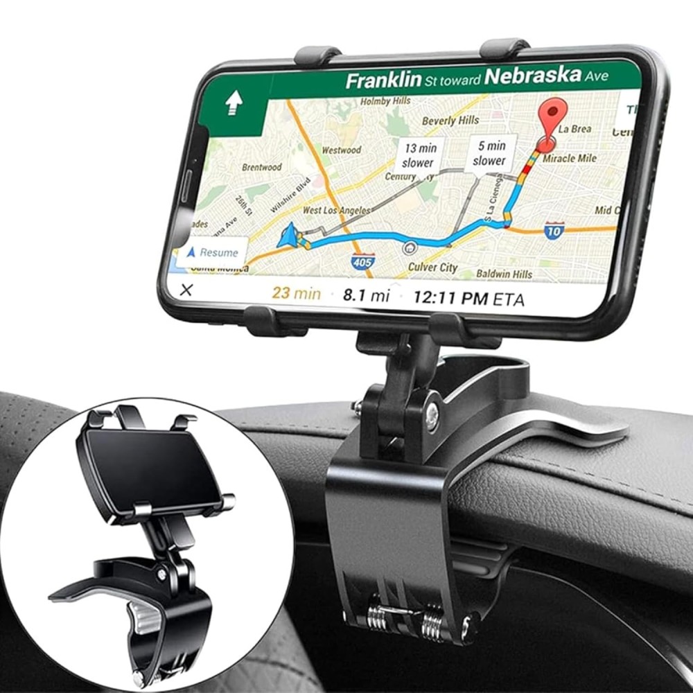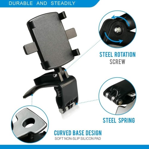 Rotation in 360 degrees: This phone holder has a sturdy, non-slip clip that allows you to firmly fasten your device to the front mirror, dashboard, or sunvisor.