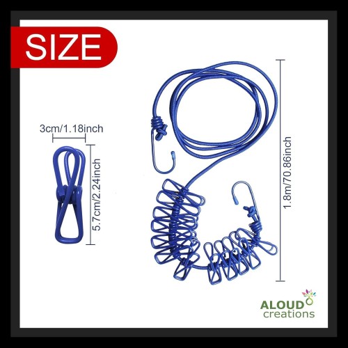 STRONG & DURABLE: The cloth drying rope is made of multiple elastic rubber bands with good tenacity and durability. The cloth hanging rope will not droop when you are drying clothes. 12 Clips and 2 hooks are made of metal that makes it strong, durable. 12 Clips and 2 hooks are rubber coated for corrosion protection.