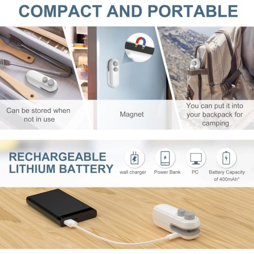 · Handheld and Portable Bag Sealer MiniThis hand held bag sealer mini can be placed on the refrigerator with magnetic on the back, so you can get it very conveniently. Its mini size enables it to be placed anywhere in the house to save space or in bags. Only weighing 0.2 pounds, it's portable to carry out for picnics and camping trips and helps keep food fresh outdoors.