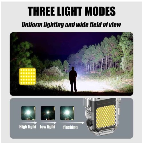 Triple-Mode FlashlightPress the side button to turn on/off. This flameless electric lighter has 3 lighting modes: low, high, and strobe modes. With 30 high performance COB lamps, the high mode is perfect for far range; low mode for close range; and strobe light for emergency situation.
