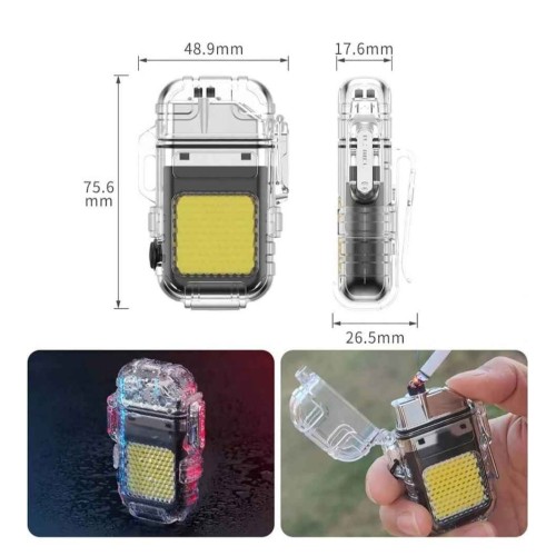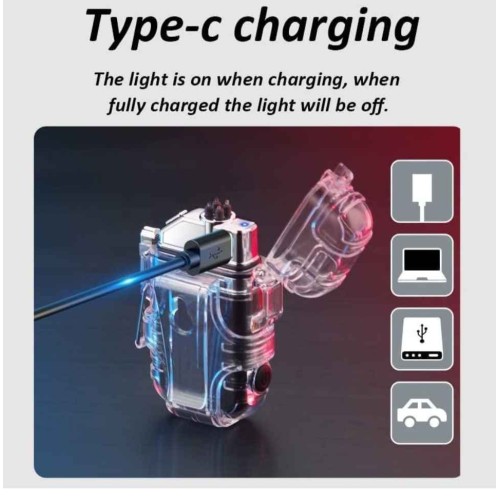 Double/Dual Arc LighterThis dual arc lighter Ignites a fire in an instant with no fear of rain and storm. With distinctive transparent shell and detachable pocket clip design, this cool usb lighter is a nice gift for outdoor enthusiasts, which can be used as a fire starter, camping tactical gear, survival tool and more.