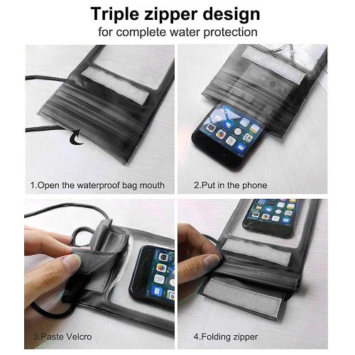 · Instruction: 1. Put the mobile phone into the waterproof bag; 2. Press the self-sealing opening to seal; 3. Fold the sealing strip; 4. Paste by the self-adhesive buckle.
